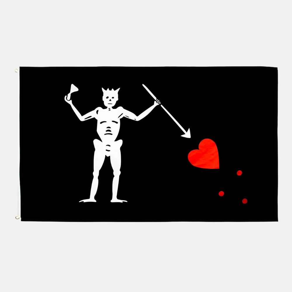- Flag flying the proud face of Blackbeard, with his menacing spear and a burning heart of red passion!