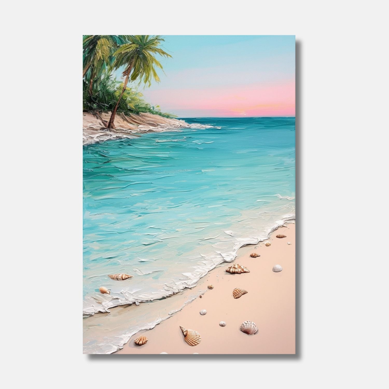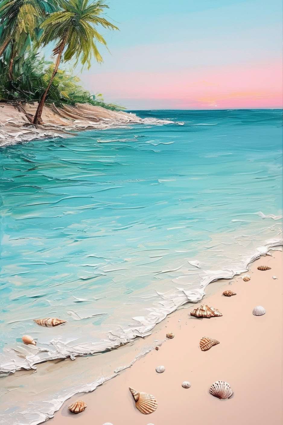 - A picturesque view of a beach at sunset with palm trees, a turquoise sea and a shore decorated with various seashells