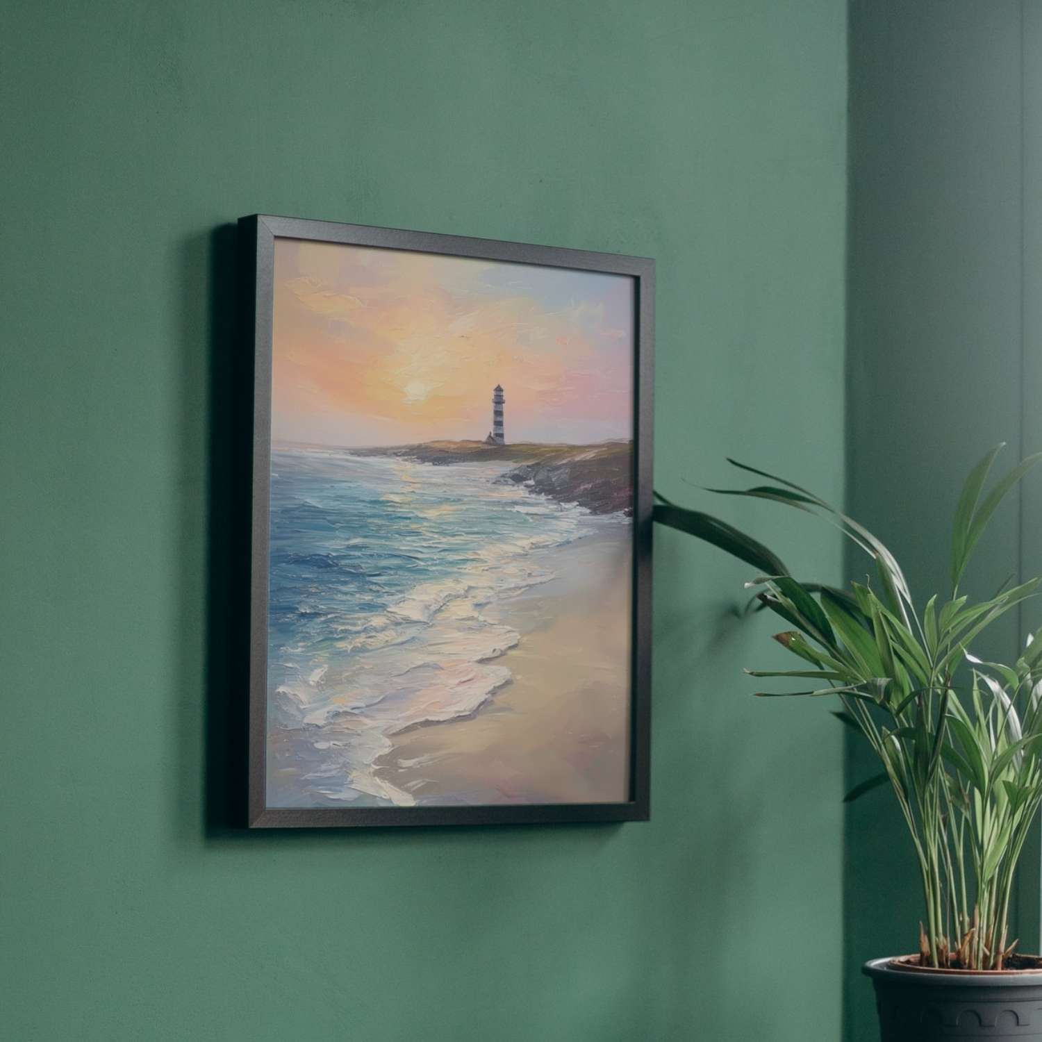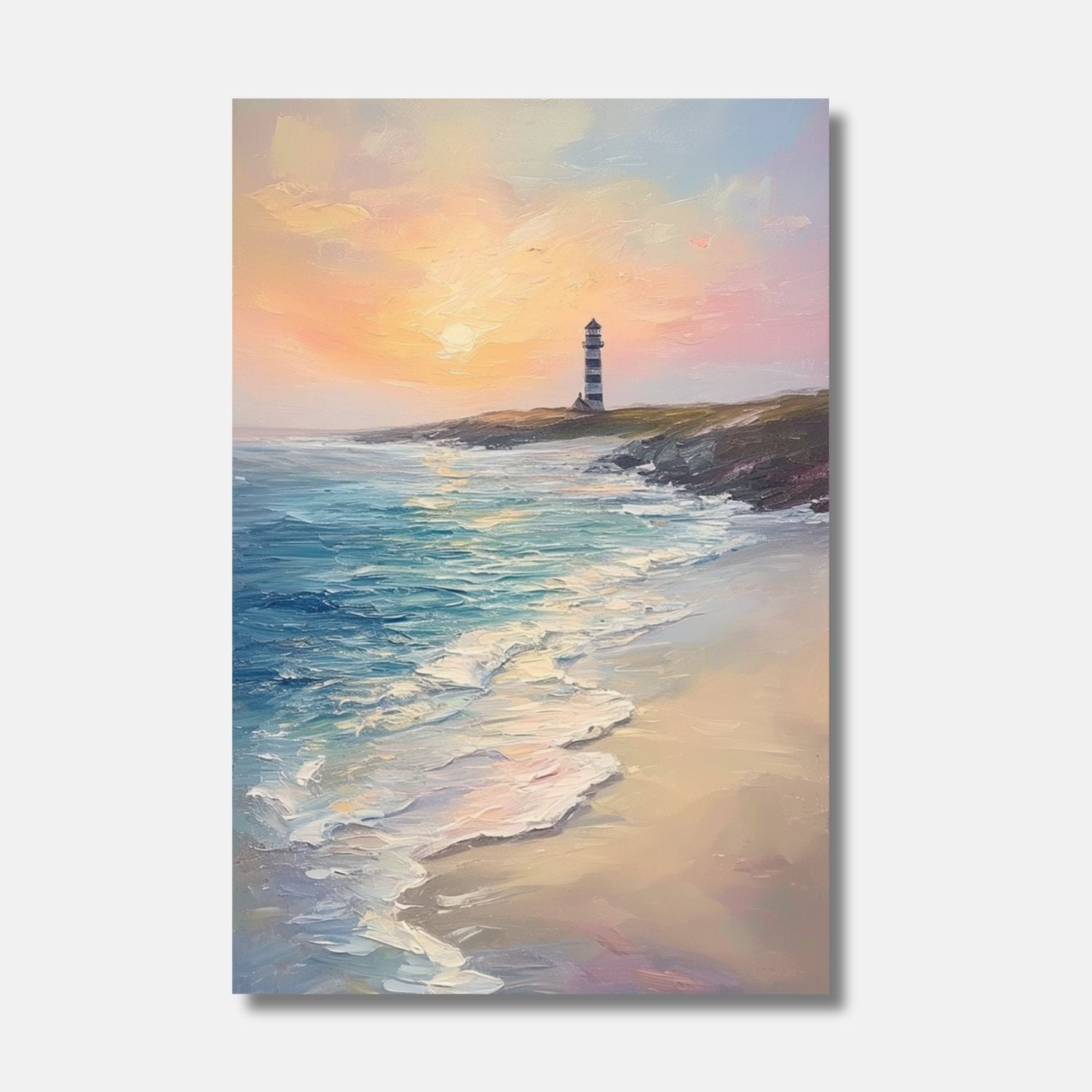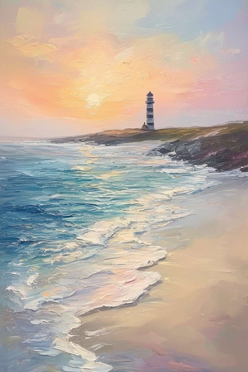 - A solitary lighthouse on a coastline at sunset with crashing waves and a pink-hued sky, evoking the peaceful spirit at the seaside