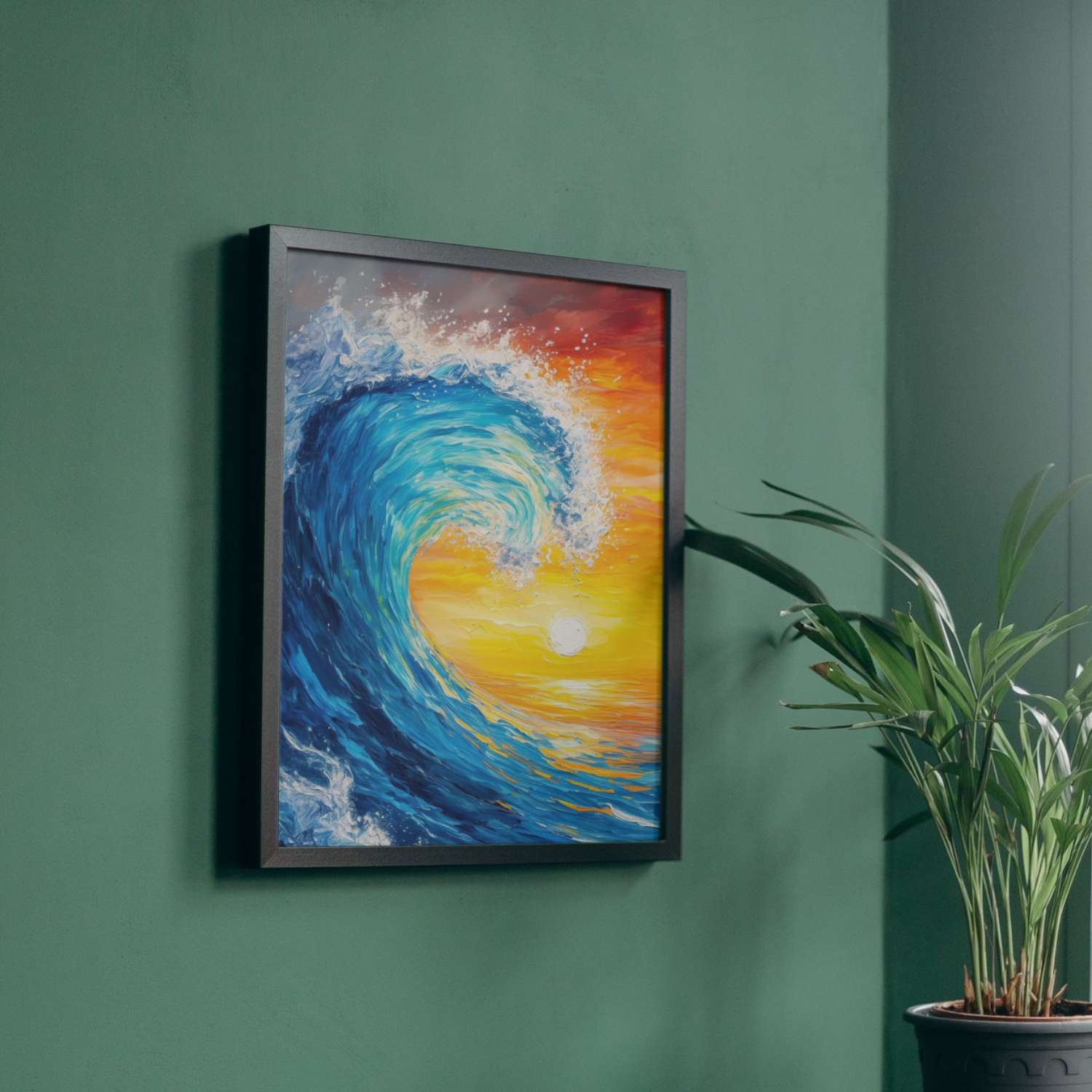 - A large moving wave, mixing the tumultuous energies of the sea with a blazing sunset.