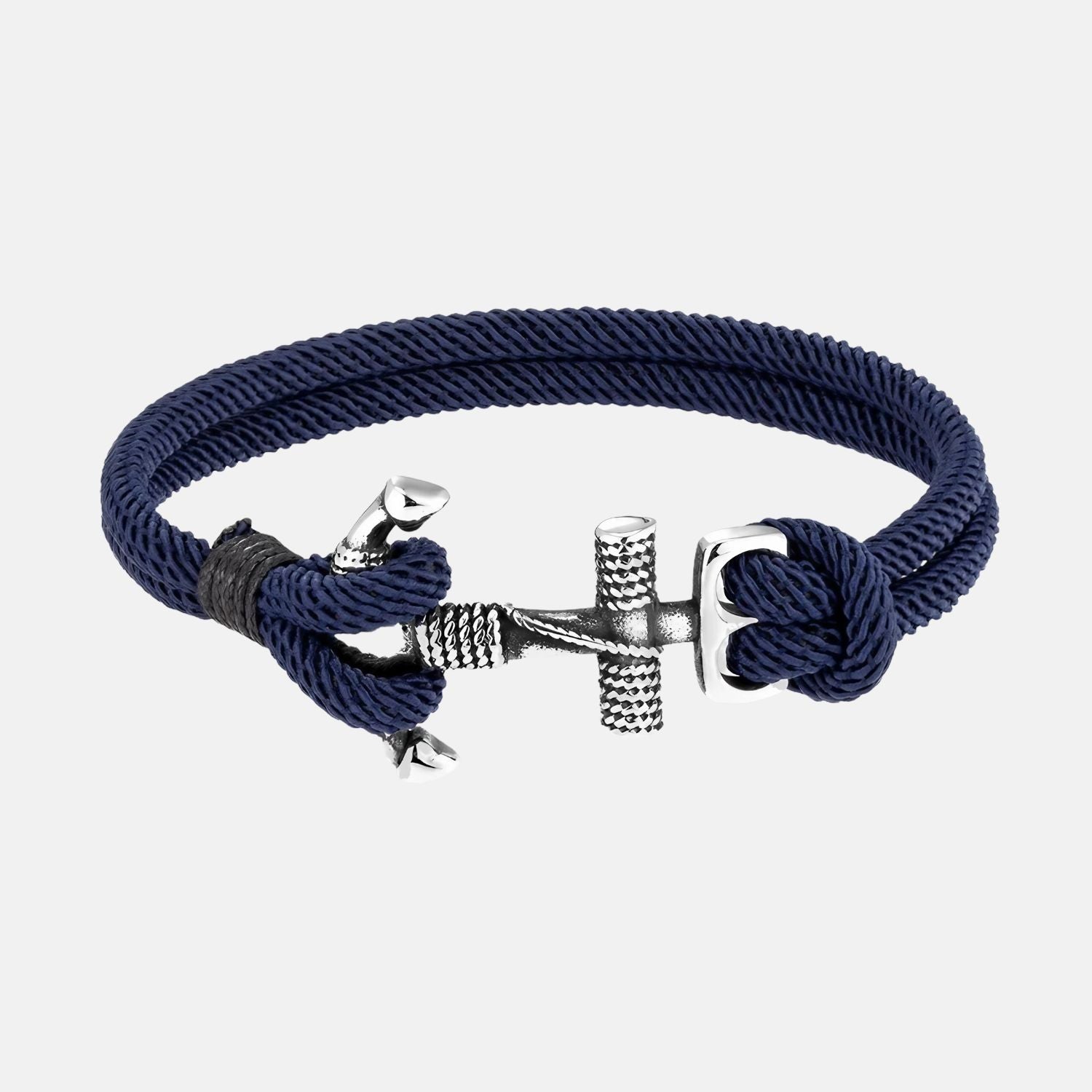 Ce bracelet nautique marine est élégamment orné d'un fermoir en forme d'ancre argentée