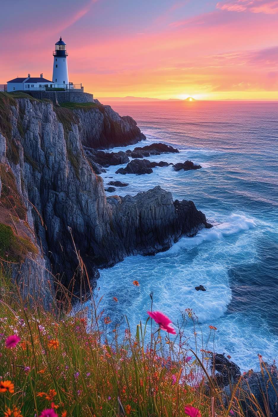 Un phare majestueux se dresse sur les falaises escarpées, illuminant les vagues tumultueuses et les champs fleuris sous un coucher de soleil éclatant