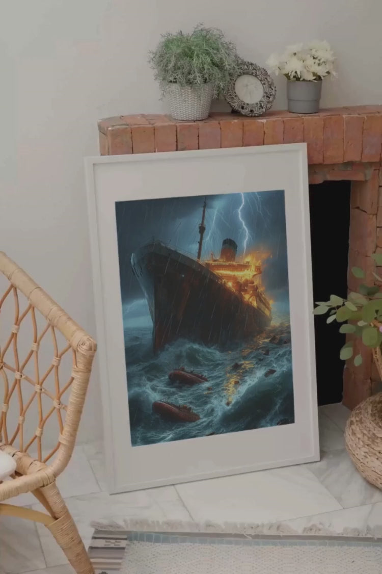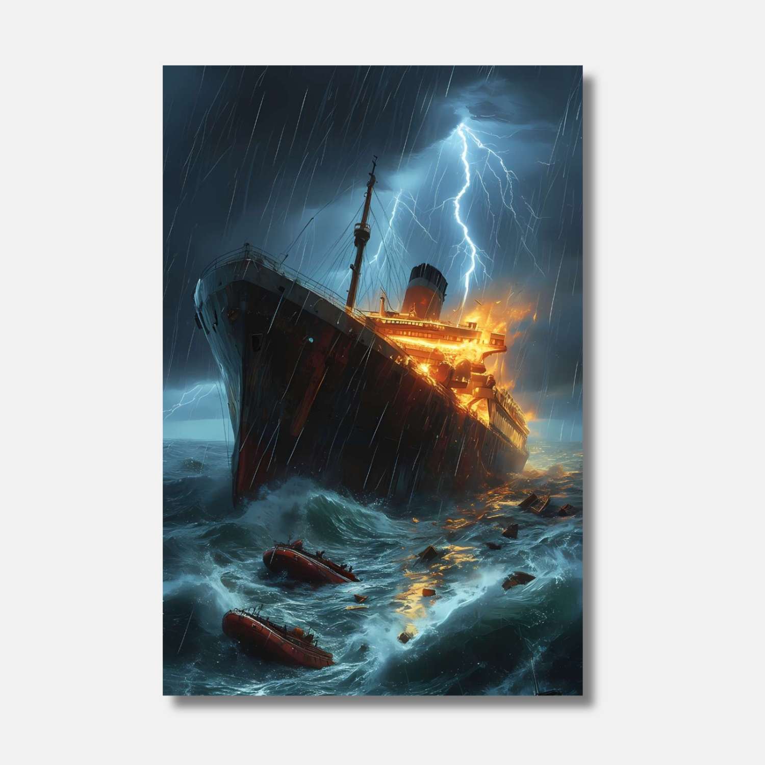 Laissez-vous emporter par la majesté de cette peinture tableau bateau, où chaque éclat de lumière et chaque vague rugissante racontent l'histoire épique d'un navire bravant l'apocalypse maritime
