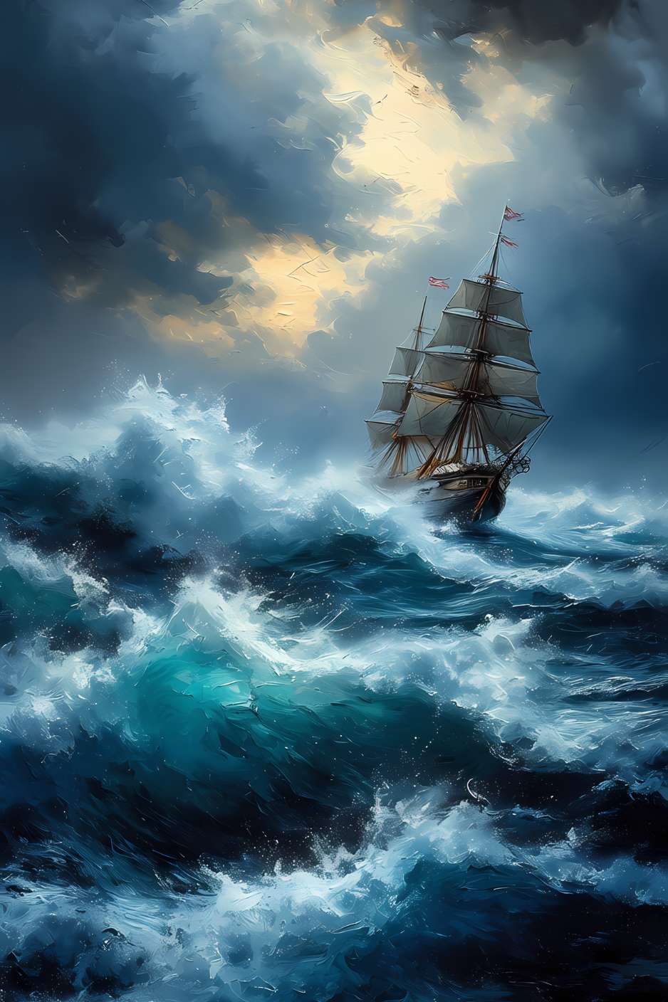 Naviguant dans un océan déchaîné, ce majestueux voilier défie les vagues tumultueuses sous un ciel menaçant