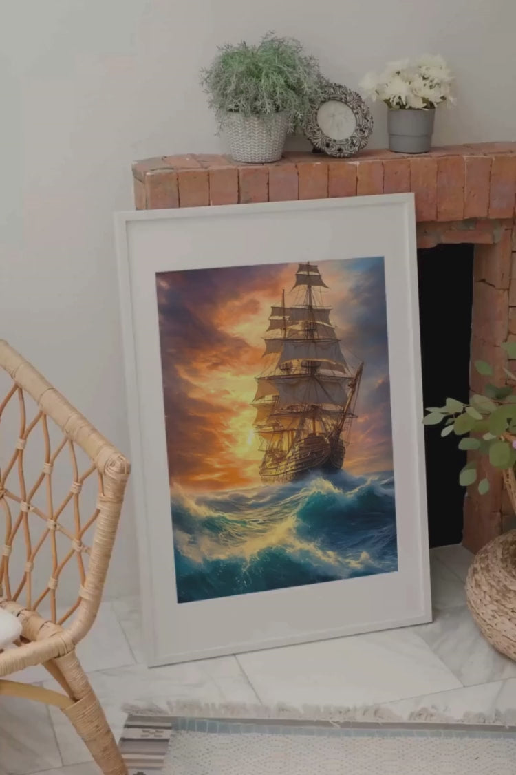 Ce tableau enchanteur capture la majesté d'un voilier affrontant les vagues sous un ciel embrasé, un hommage vibrant à la beauté et à la puissance de la mer
